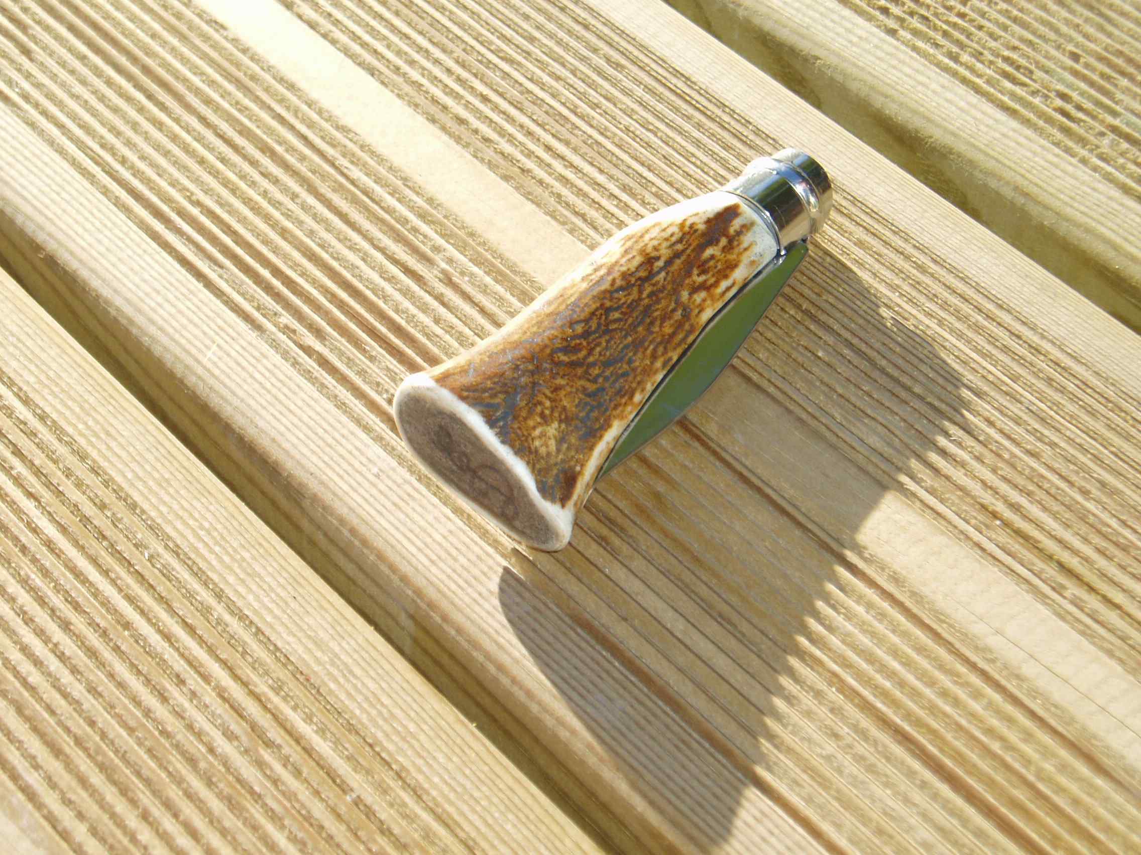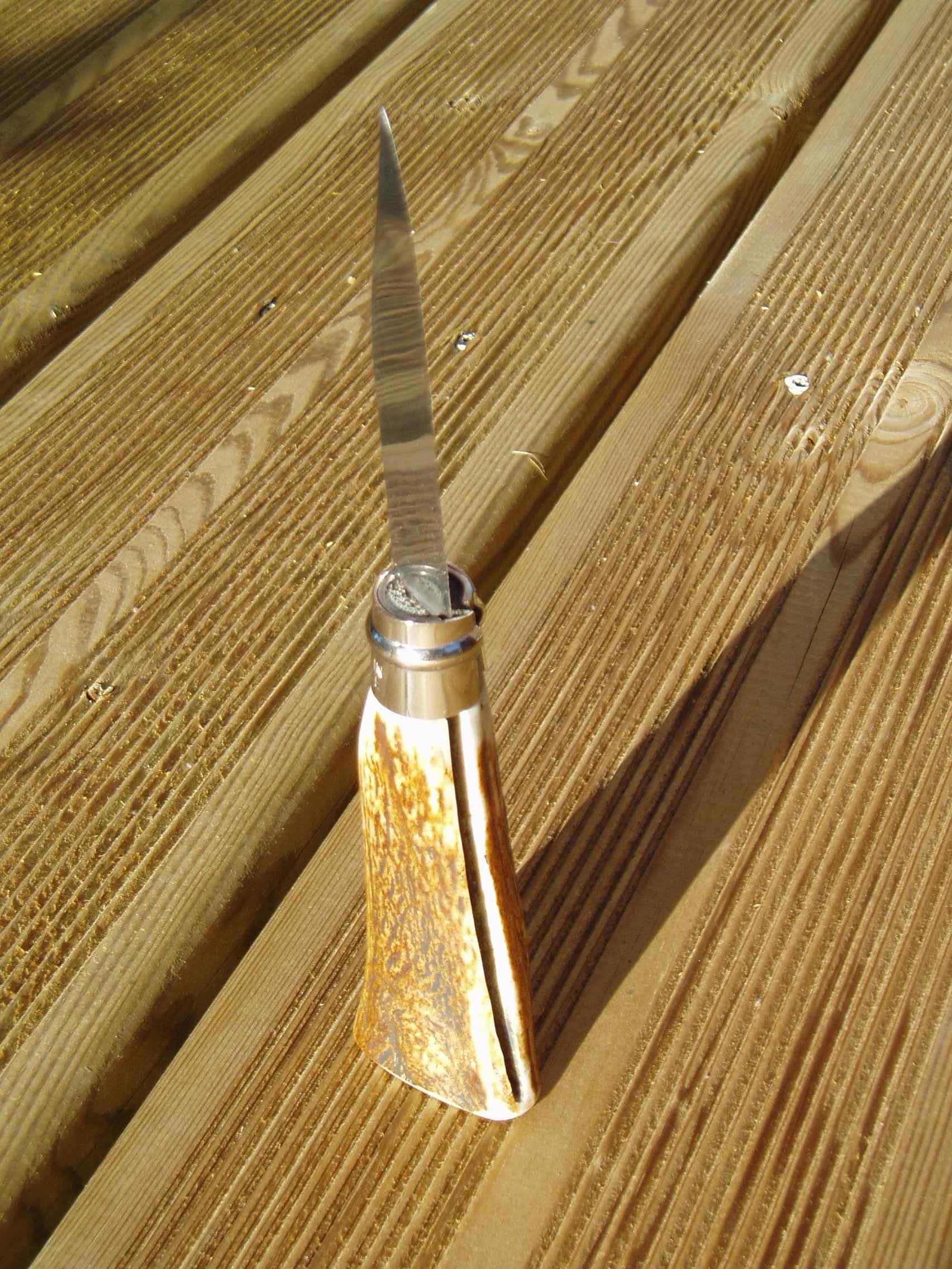 Je me suis amusé avec un bois de renne : la difficulté réside dans le fait que le cœur du bois est très poreux et donc très fragile. Pour solidifier cette partie au niveau du clou, j'y ai mis de la loctite... Par contre, je n'ai pas fait attention à la courbure du bois. Conclusion : c'est un couteau pour gaucher ! (Je suis ambidextre.)