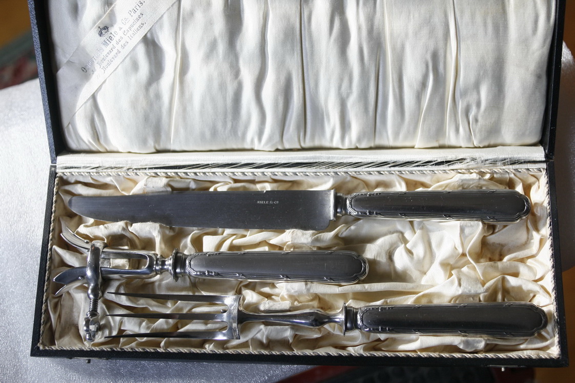 Voici donc ma recherche : j'ai dans un bel écrin siglé au nom de "Orfèvrerie MIELE & Co - Paris" un ensemble de service à gigot en argent et en assez bon état, comportant le couteau, la fourchette et la pince à gigot (voir photo). Le couteau pèse 150 g pour 32 cm et la fourchette 180 g pour 29 cm. La lame du couteau, qui ne semble pas être en inox, est frappée du sigle "MIELE & Co".