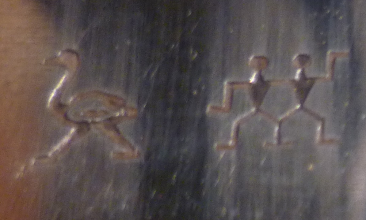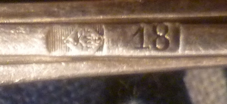 Sur un couvert d'enfant, se trouvent les poinçons ci dessous : sur la lame du couteau, deux estampilles côte à côte : celle de l'autruche de la WÜRTTEMBERGISCHE METALLWARENFABRIK (WMF) probablement (elle apparait aussi sur le manche, comme sur celle de la fourchette mais avec en plus une étoile sous le 18) puis ce personnage double. Auriez vous une piste ?