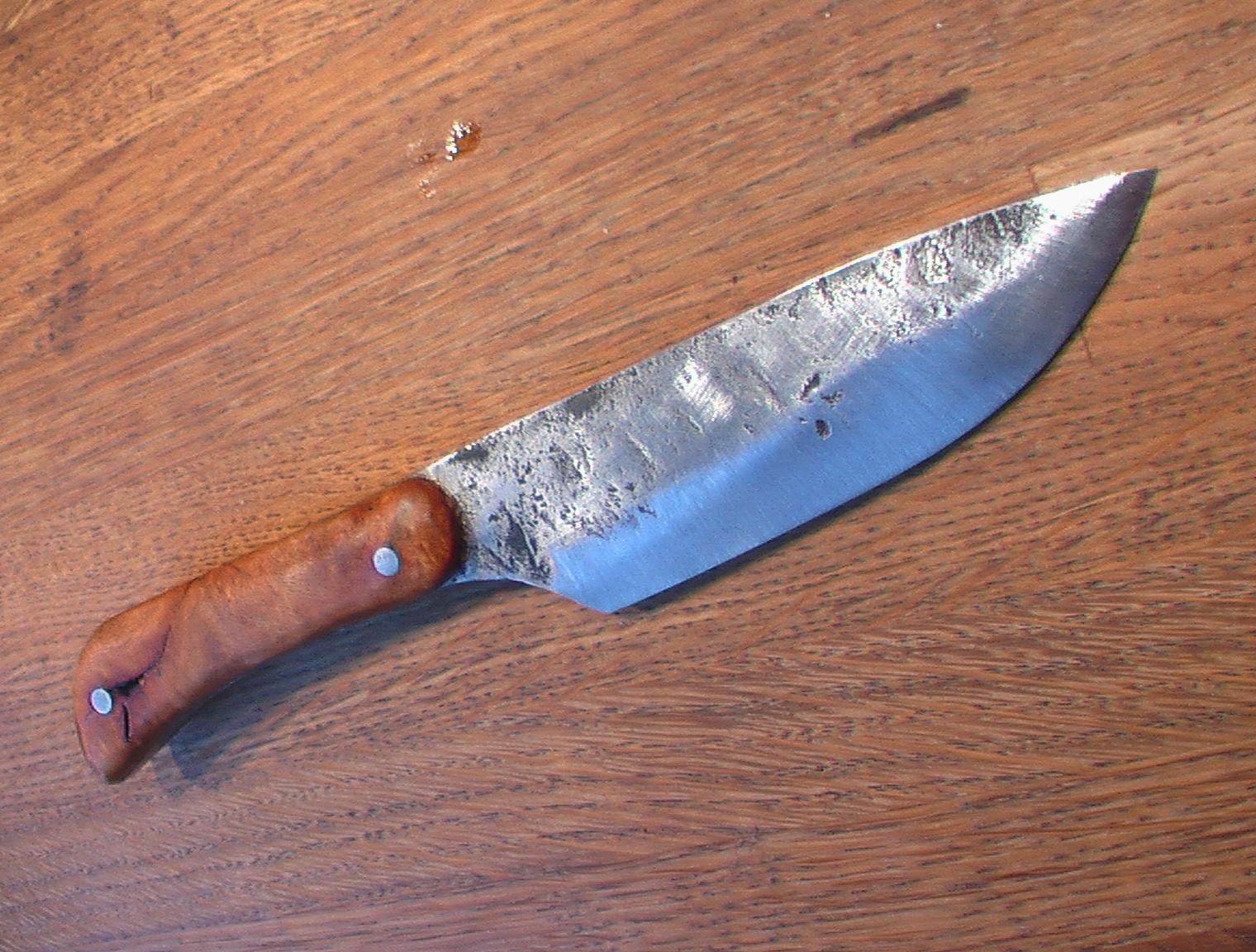 Il s'agit d'un couteau forgé en hitachi blue steel. En fait, c'est surtout la lame qui est forgée (l'émouture, notamment) ; j'ai un peu triché pour le manche.