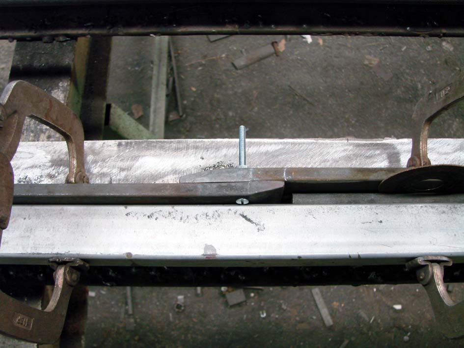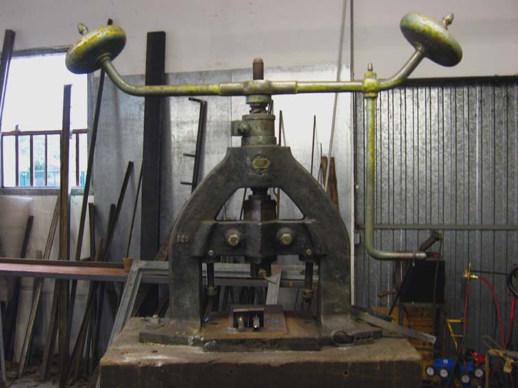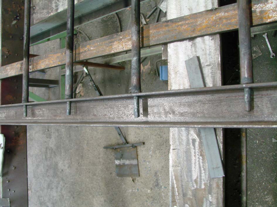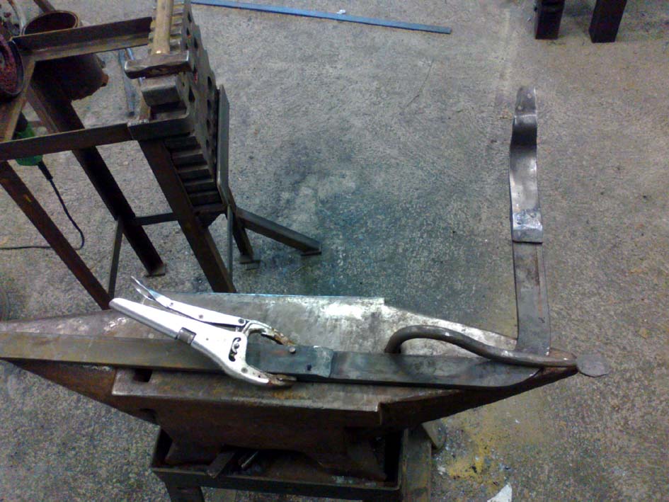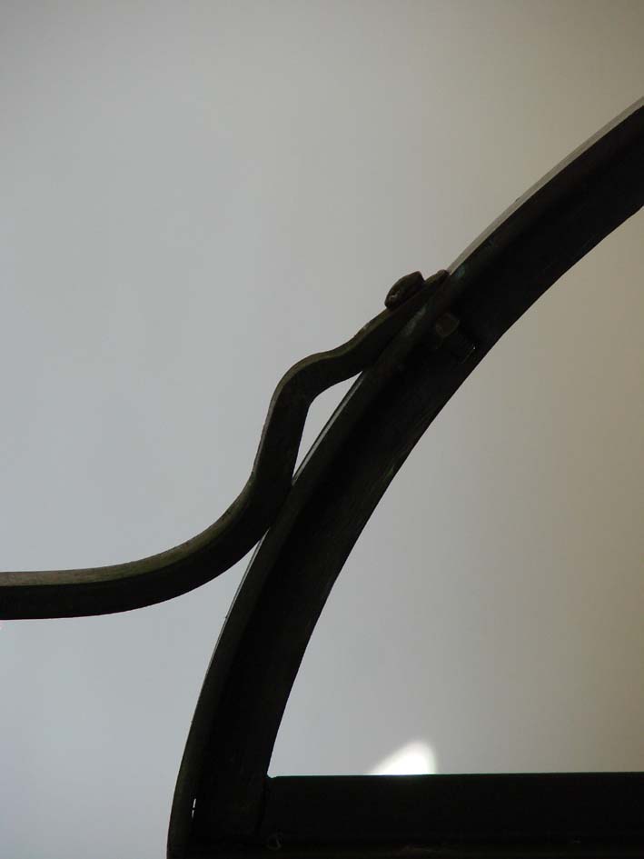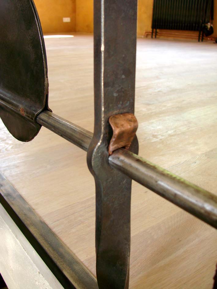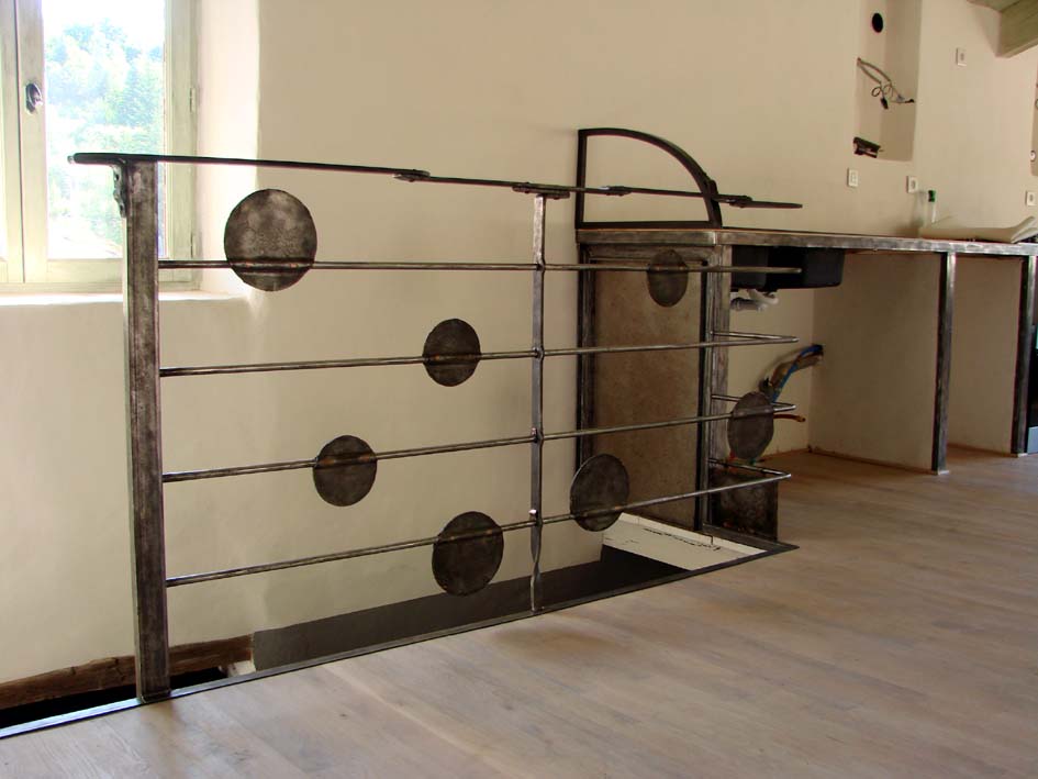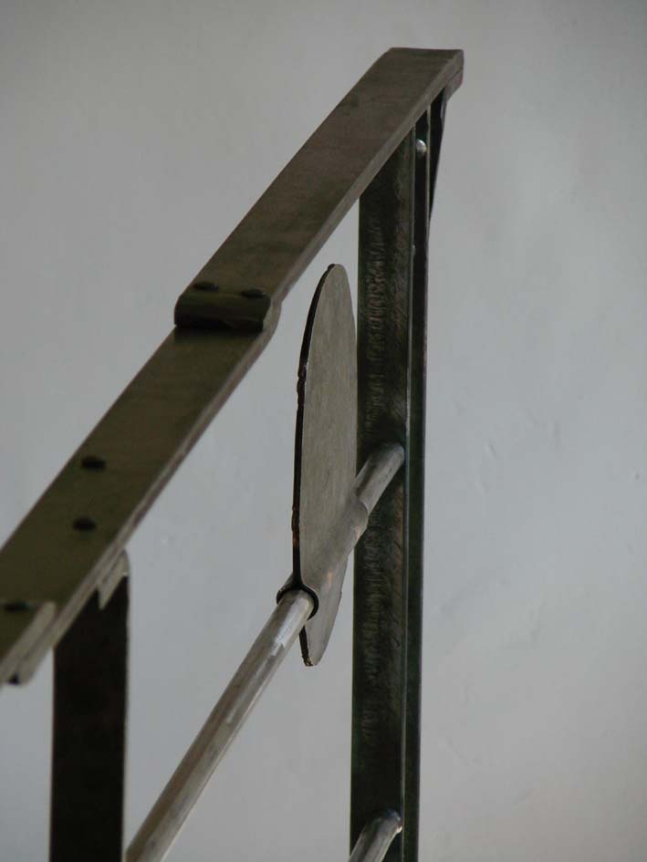 Le pilastre est en petit U de 60, le pied en fer plat de 30 x 10,les lisses en rond de 16 et la main courante en 40 x 8, le tout est assemblé par des rivets en acier.