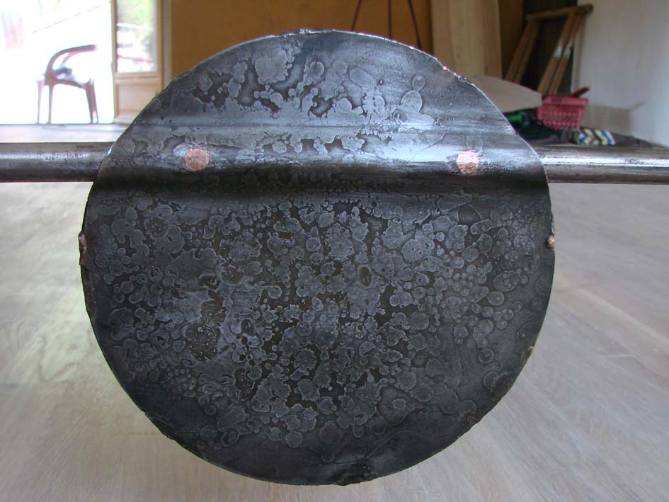 La main courante est « brunie noir » puis rustol , les « notes de musiques » brunies au perchlorure puis cirées ; le reste est brossé et passé au rustol.