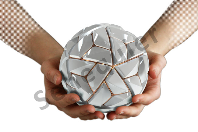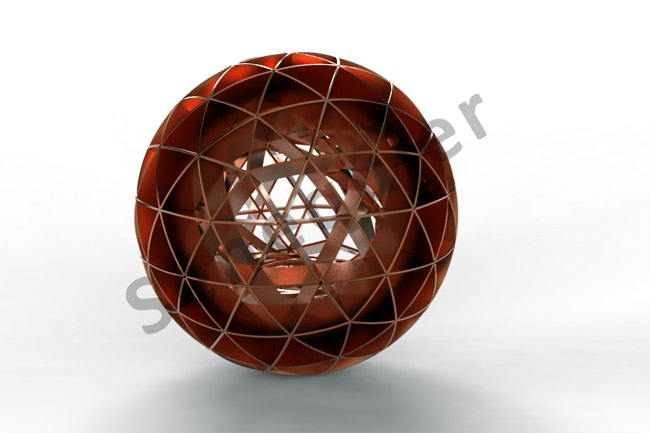 L’objet est une sphère composée d’une résille structurelle dans laquelle s’articule un gyroscope. Plusieurs maquettes de principe ont été réalisées dont une en impression 3D pour valider toutes difficultés techniques.