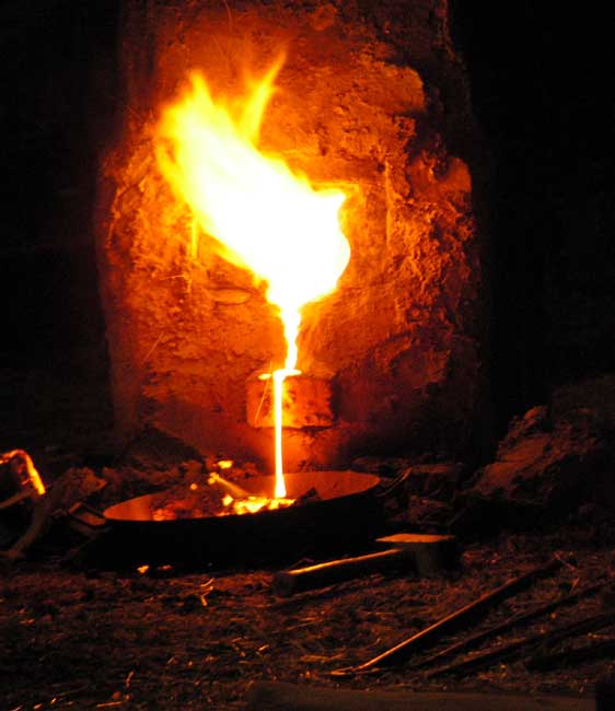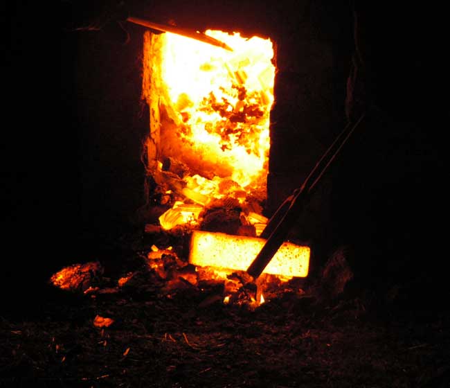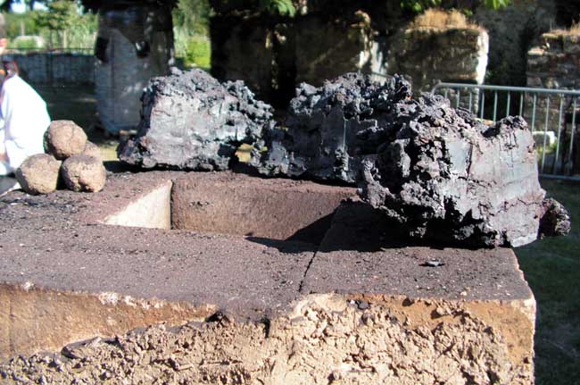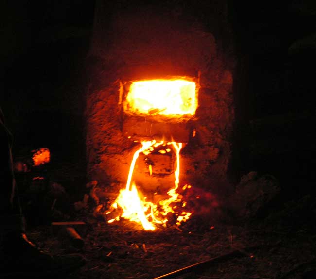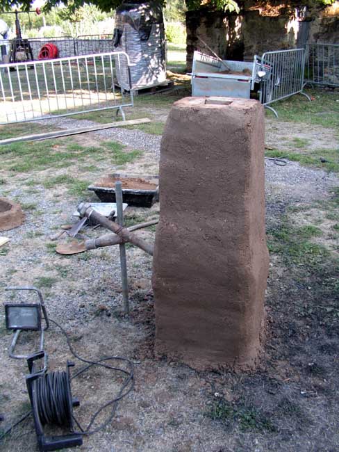 - Façade avant du bas - fourneau de type japonais (16ème siècle) en cours de finition. Les briques centrales émergentes seront les premières retirées pour permettre l'écoulement du laitier.
