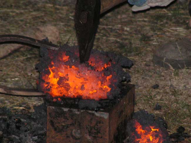 Dans un récipient se trouve du charbon de bois pilé qui sert à la carburation de surface de la zone de trempe pour la pointerole . Les burins sont carburés directement par le foyer de forge .