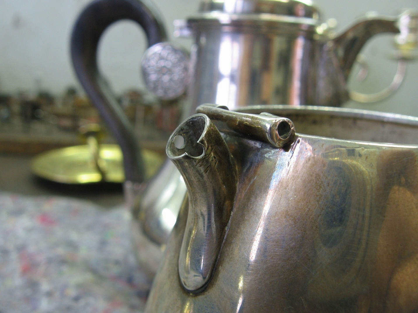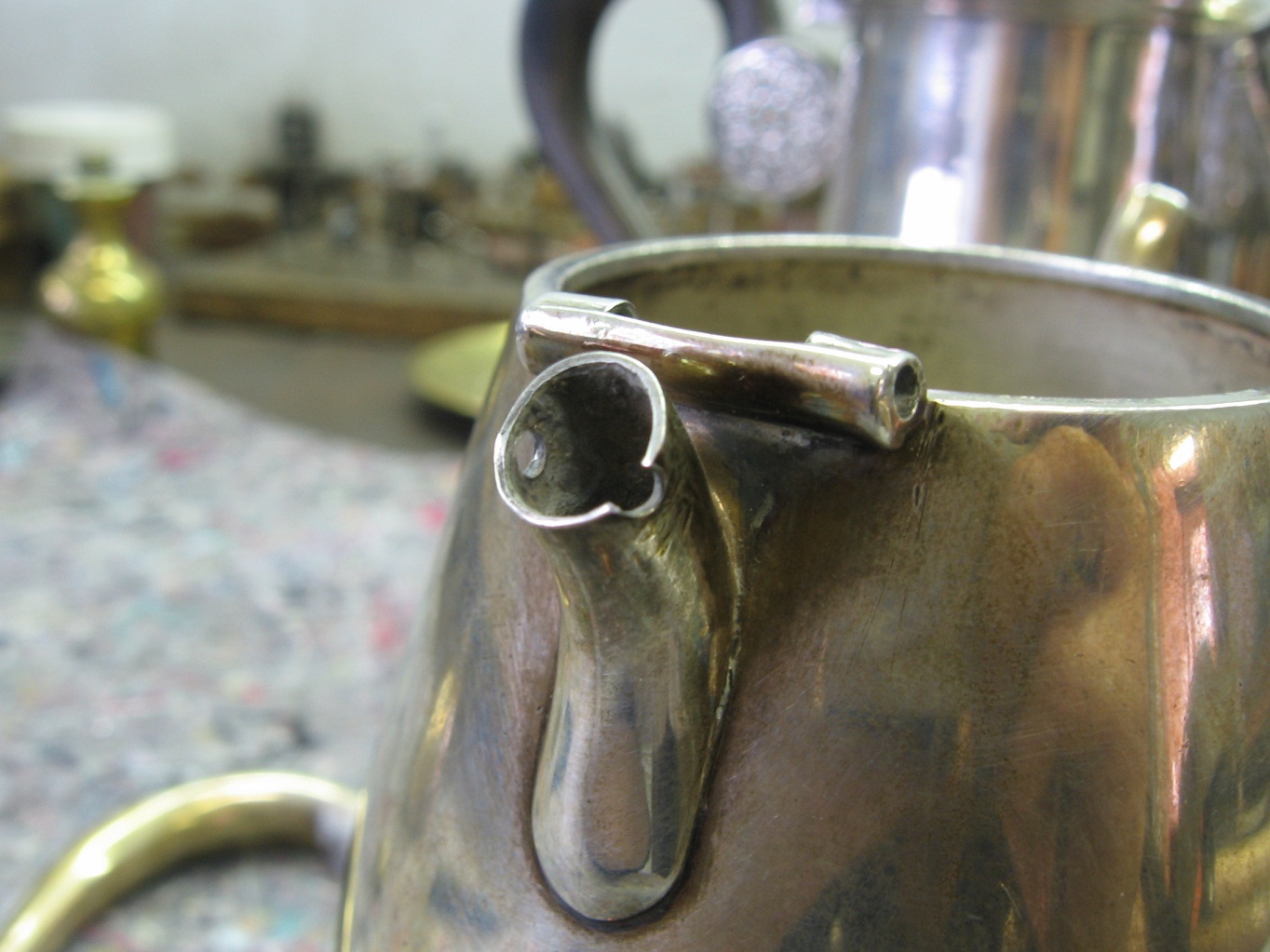 Voilà, j'ai une petite verseuse égoïste en argent massif à réparer : la goupille a fini par déchirer le métal au niveau de l'anse.