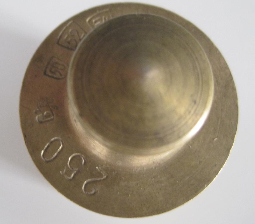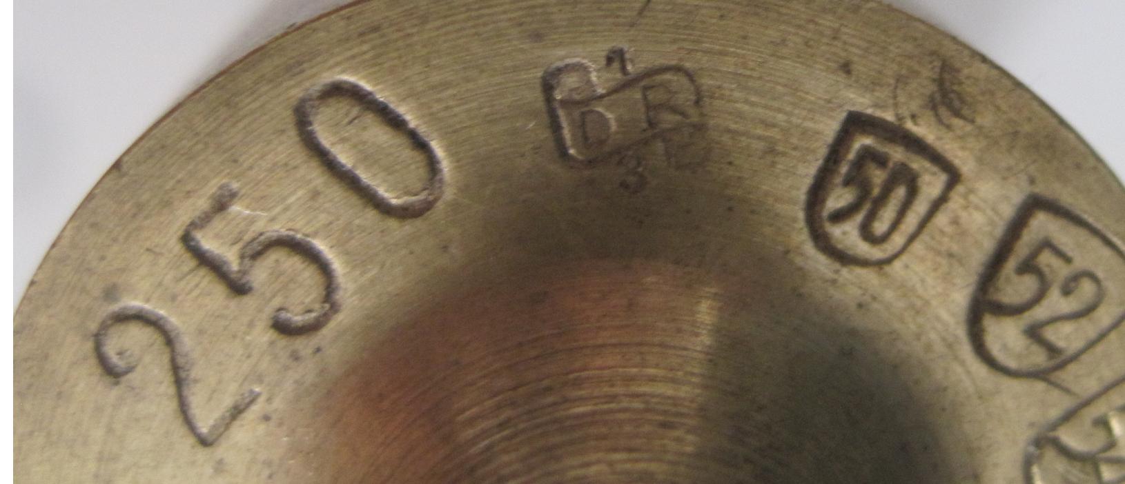 Il y a des poinçons dessus (1 DR 3, 50, 52,...) mais je n'ai pas trouvé de quoi il s'agit sur internet. Le 250 représente la masse (250g). (photos en pièces jointes)