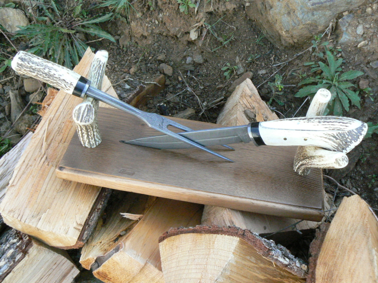 Voici un service à viande dont les matériaux m'ont été offerts par deux amis, Christophe Oge pour le damas et DanielC pour les bois de cerf.