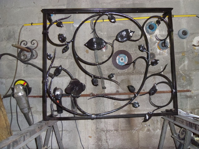 Ce motif est fini bagué dans un garde corps de 1060/900, en carré de 20 coiffé d'une main courante moulurée. Il a subi un traitement : rustol + pigment noir (pas sec).