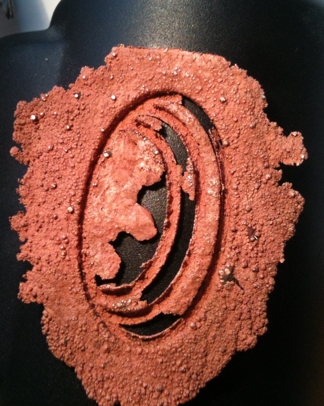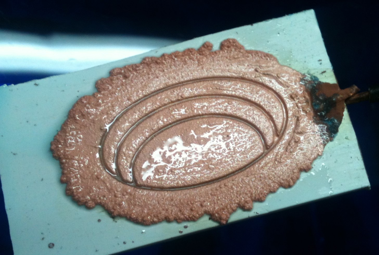 La cathode est un tube de cuivre, l'agitation est minimale avec rajout de 200g de sulfate de cuivre dans le bain car plus de solide au fond du bac. La métallisation a duré 15 heures environ et le moule en bois s'est gorgé de soluté et s'est déformé.