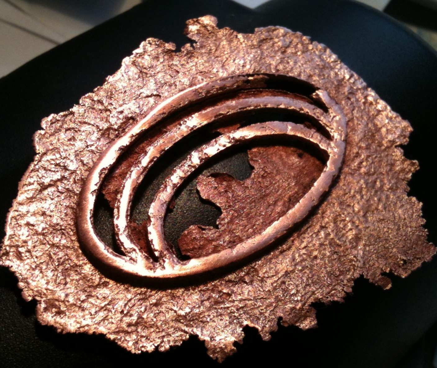 Vu la déformation importante du moule, j'ai été contraint d'interrompre le processus. Le "démoulage " a été délicat et l'ensemble est venu avec une importante quantité de bois collé à la pièce. Afin de l'éliminer sans l'endommager, j'ai passé l'ensemble au pistolet chauffant à 650°C afin de carboniser le bois. Après brossage, passage au bain sel/vinaigre et ponçage, j'ai pu obtenir une ébauche qui présente un bel aspect cuivre comme celui que j'ai l'habitude de travailler en émaillage, certes avec des défauts qu'il faudra optimiser. Les contours ne sont pas parfaits mais je pense que le moule y est pour beaucoup. Je pense aussi avoir endommagé la pièce lors d'un passage à la brosse métallique du touret (trop puissante pour polir).