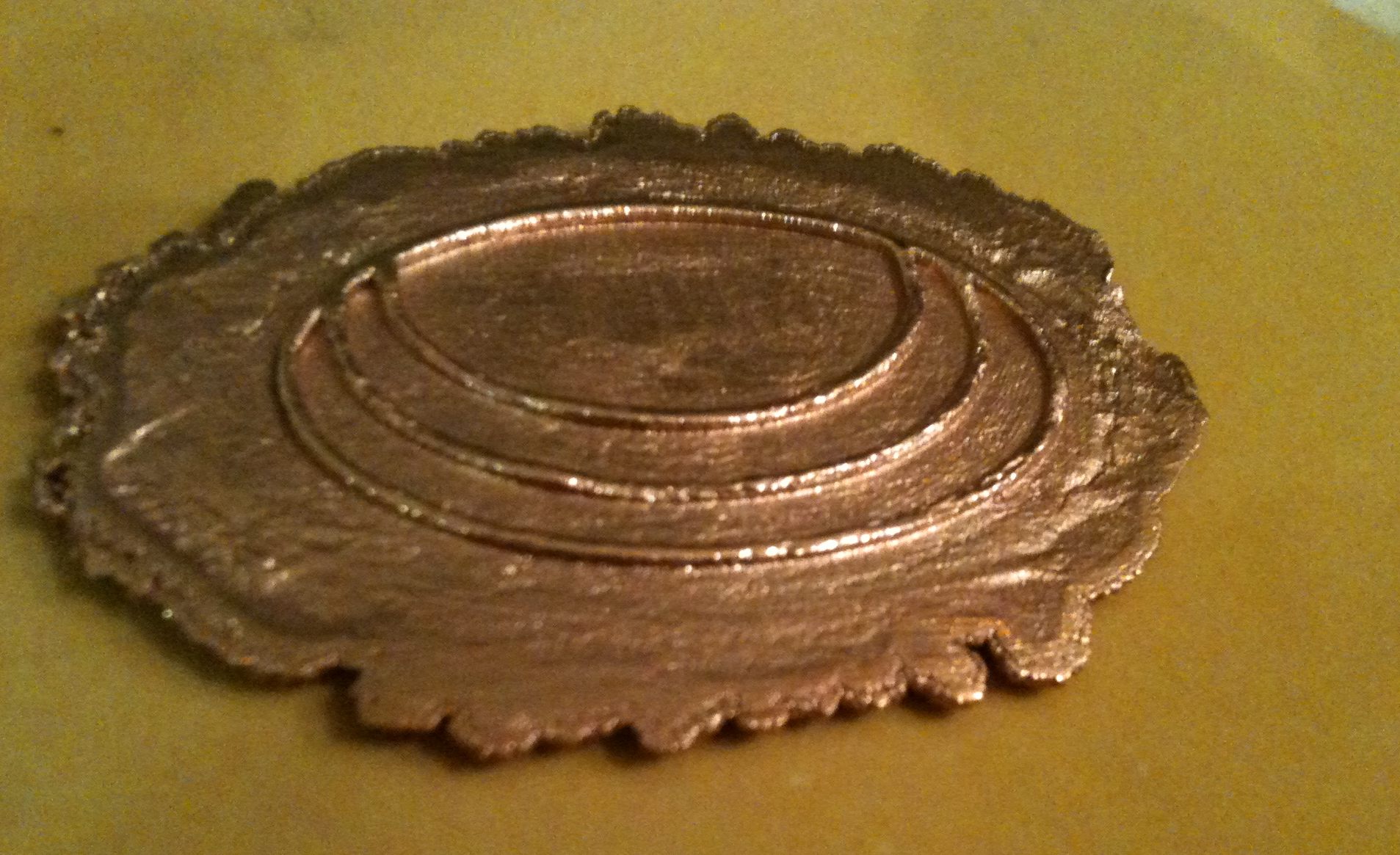 Le moule en bois, fraisé avec une pointe de 3mm, a été enduit de cuivre (en suspension dans acétone + vernis).