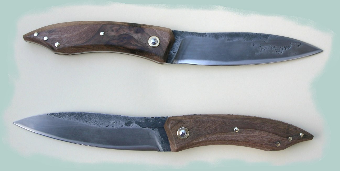 Il y a des défauts qu'on ne voit pas sur les photos mais au niveau des rivets, il y a quelques coups de marteau disgracieux sur le bois, je n'ai pas réussi à les éviter :-( ... Bien sûr, ça se voit lorsqu'on regarde les manches sous certains angles.